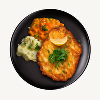 *Składniki: Kotlet schabowy (ca. 70 g) + Ziemniak gotowany (ca. 70 g) + Marchewka z groszkiem z puszki konserwowa (2 łyżki) + masło (1,5 łyżeczki).